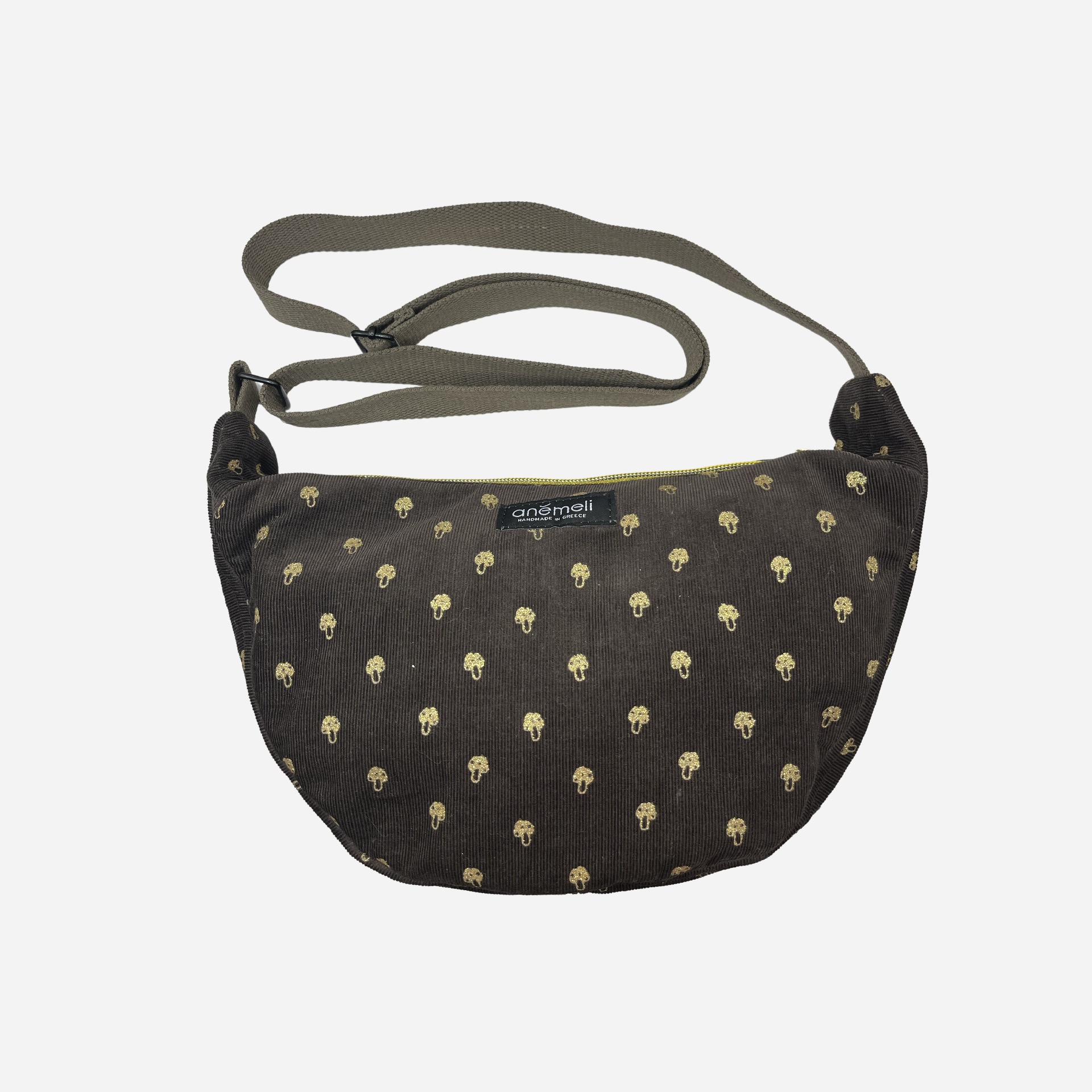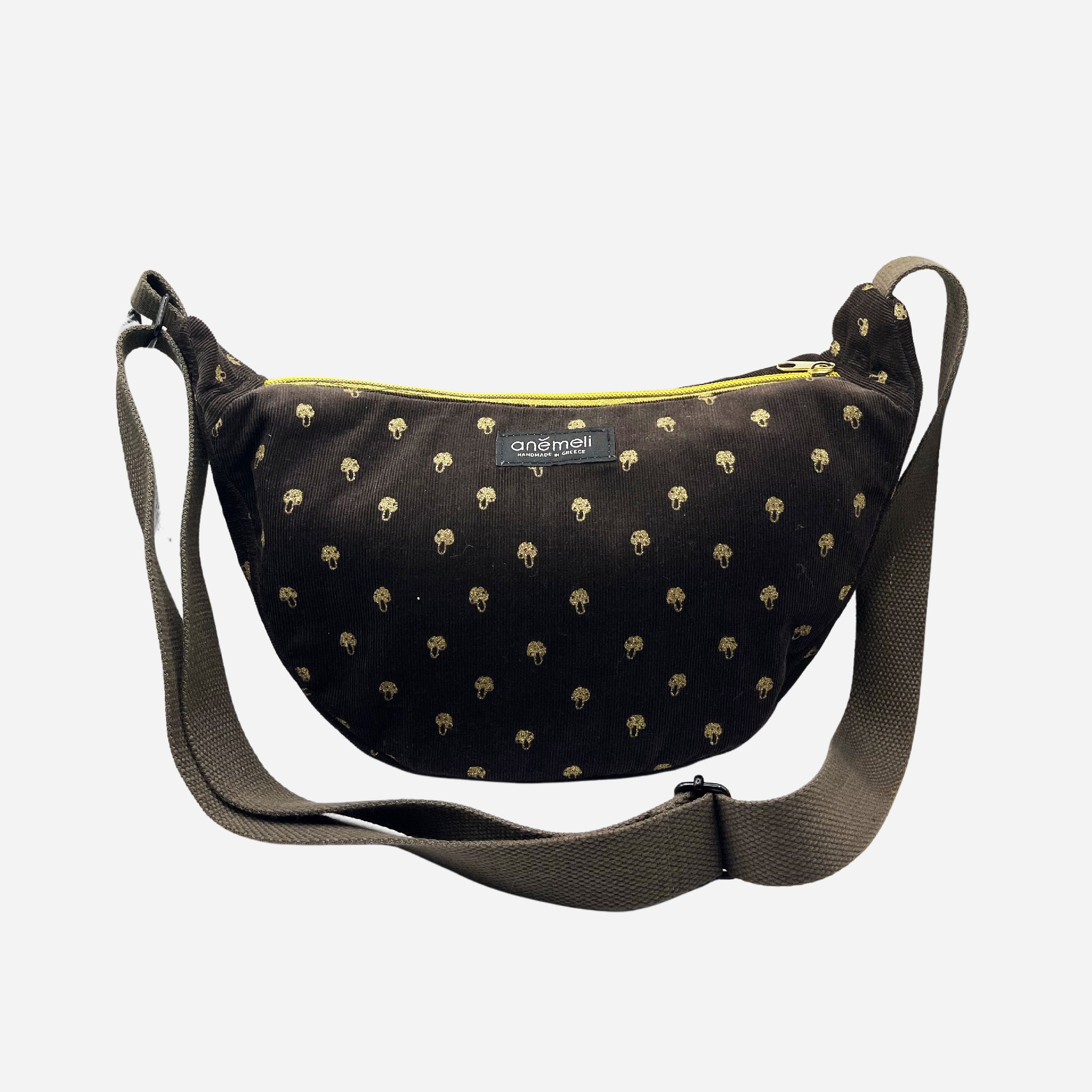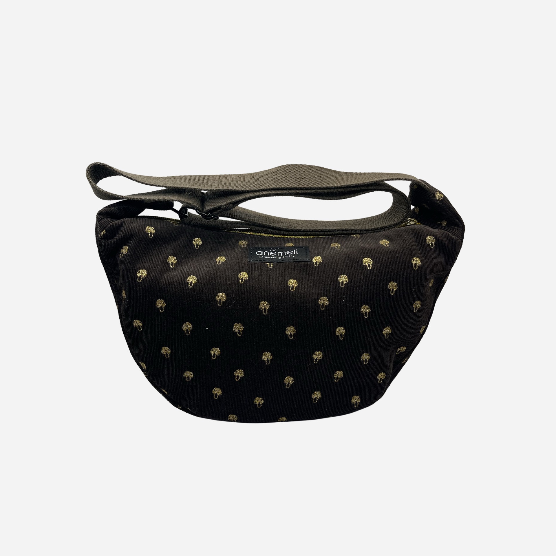 Η Golden Shroom δεν είναι απλώς μια τσάντα. Είναι μια μικρή απόδραση στη φαντασία, με cozy υφή και παιχνιδιάρικη διάθεση. Από μαλακό καφέ κοτλέ ύφασμα, στολισμένη με μικροσκοπικά χρυσά μανιταράκια που λάμπουν διακριτικά – σαν να βγήκαν από ένα δάσος με dress code.