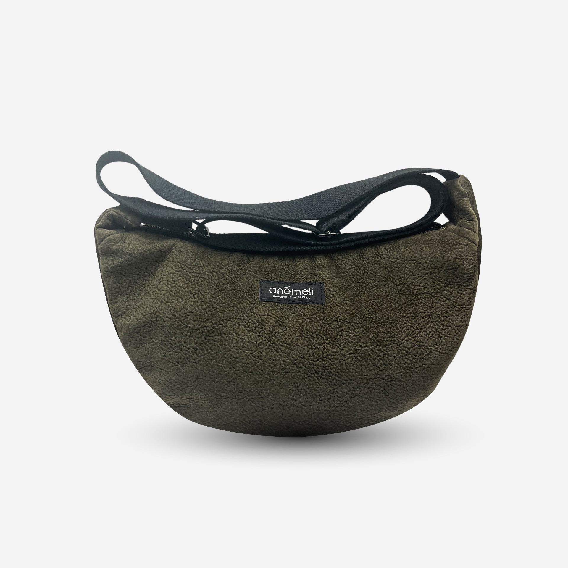 Η Olive Nomad είναι η crossbody τσάντα που θα σε ακολουθεί παντού, από το πρωινό τρέξιμο της πόλης μέχρι το απογευματινό chill στο βουνό (ή απλώς στο καφέ δίπλα). Φτιαγμένη από μαλακό, ανάγλυφο ύφασμα τύπου sherpa με ελαφρώς σπασμένη υφή, σε βαθύ χακί/ελαιοπράσινο που ταιριάζει με κάθε χειμωνιάτικο outfit – από φούτερ μέχρι μάλλινο παλτό.